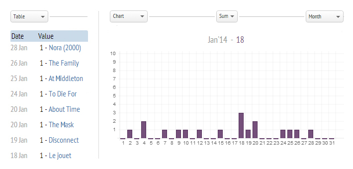 Keyboard Type: Plus Track the movies you watched or the ones you want to watch. The chart will show your movie trends and will give you unexpected stats of how many movie you have watched.